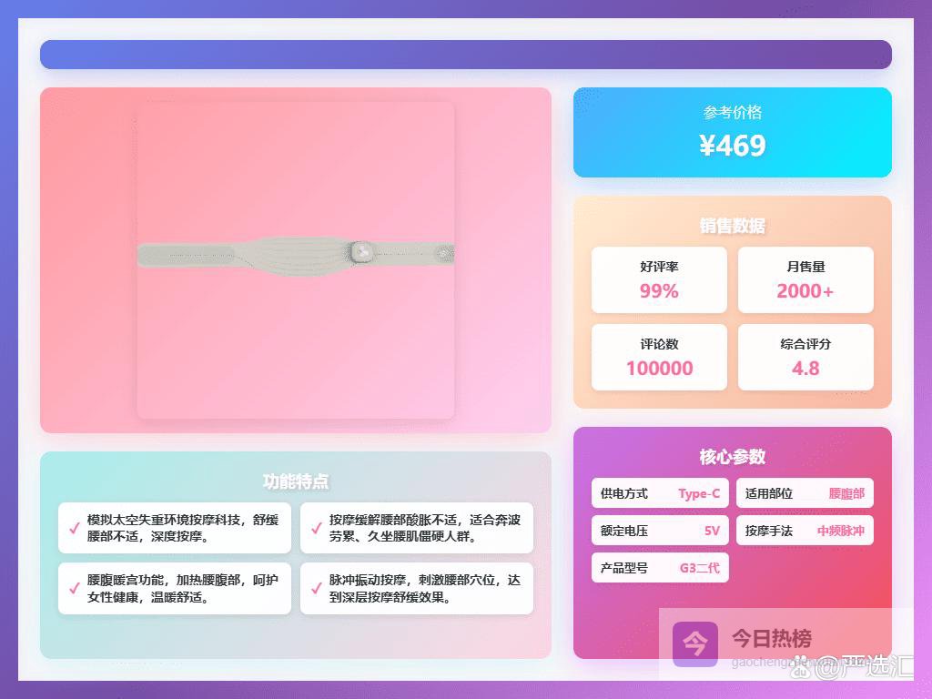 九、妙界参数:热敷面积500cm²、三档震动、双区发热、支持插电、适合腰围60-110cm