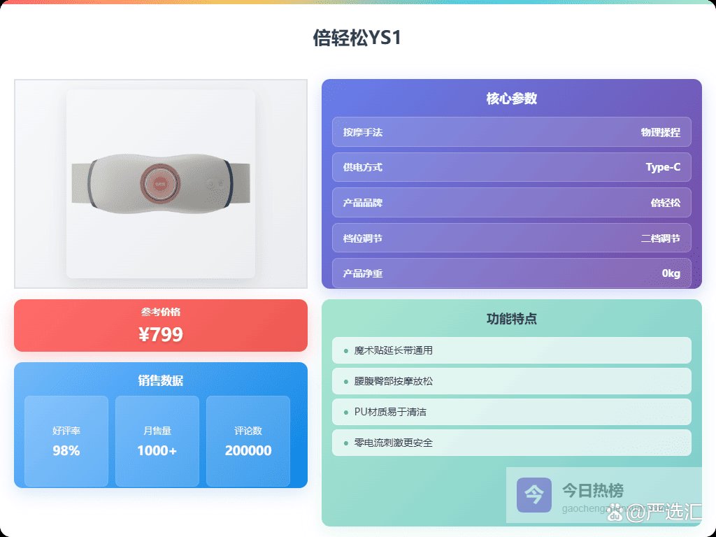 点评:这款倍轻松YS1,轻巧便携,放在包里随身带着,随时随地都能按摩放松,挺方便的。它特别适合腰部和腹部,有效帮你缓解长时间久坐带来的不适,用起来也蛮舒服的。而且,采用物理揉捏手法,感觉更自然,不会像机器那样冷冰冰。
