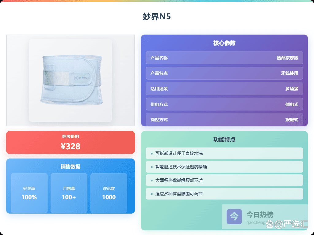 点评:这款妙界N5腰腹按摩仪,大面积热敷,帮你缓解腰部和腹部的不适,像个温暖的抱抱,让你觉得很放松。操作简洁,按键式控制,就算不怎么会玩电子也能轻松上手,30分钟自动停止设计也很贴心,安全又省心。