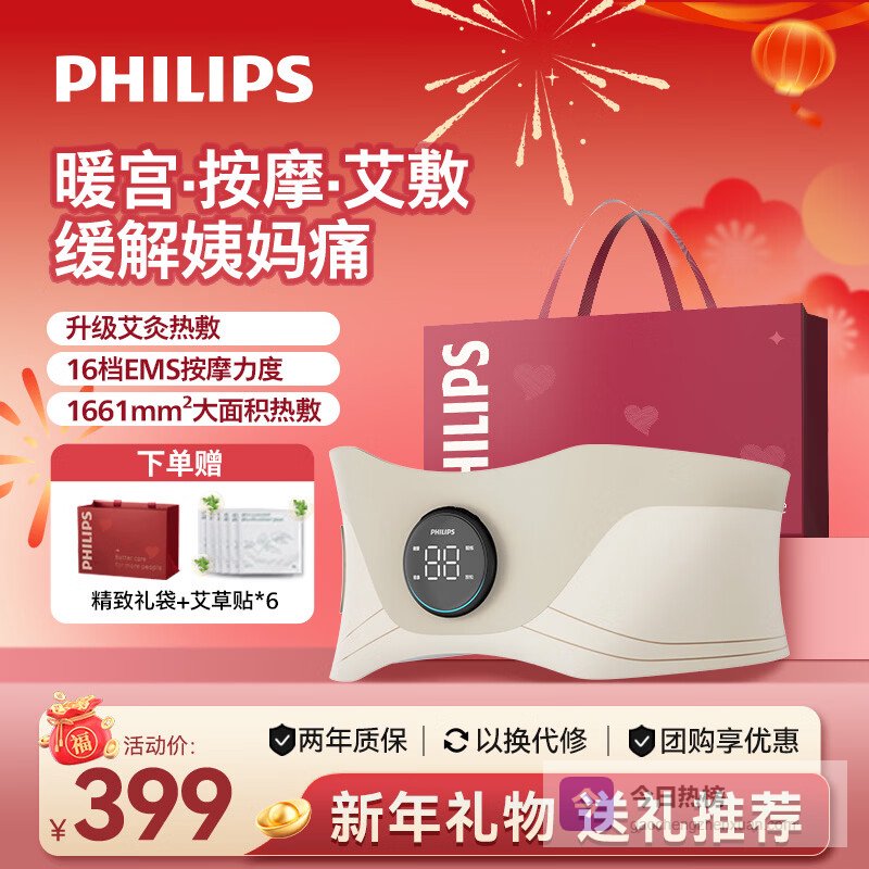 飞利浦(PHILIPS)腰部按摩器暖腰腹艾草热敷按摩暖宫腰带EMS按摩艾养缓解酸胀送女友老婆妈妈新年年货生日礼物3306B¥