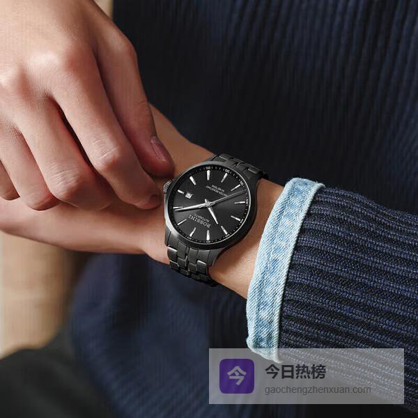 推荐理由:这款罗西尼夜光手表,黑色表盘搭配不锈钢表带,看起来非常稳重又时尚,出门配西装休闲都应该不错。尤其是夜光功能,即使在光线很暗的环境下,也能轻松看清时间,特别方便。