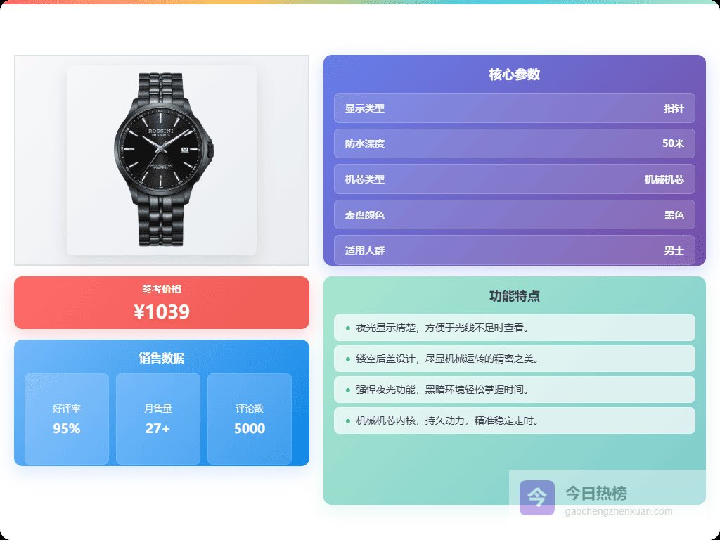 推荐理由:这款手表是真的挺特别,自动机械机芯,不用电池,只要你戴着,它就能自己走,非常方便又环保。镂空盘面设计让你能看到里面的机芯,机械美感十足,看着就很有范儿。