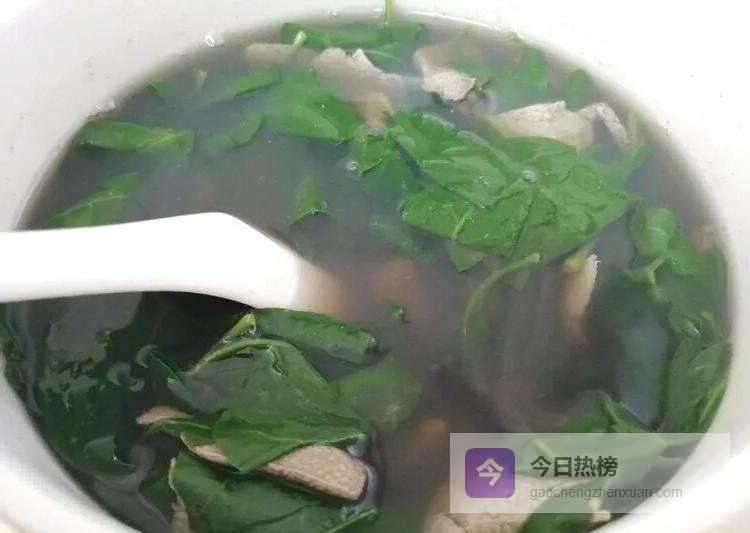 材料:鲜枸杞叶200 g、猪肝200 g、枸杞子少许、姜丝、盐、味精、葱花