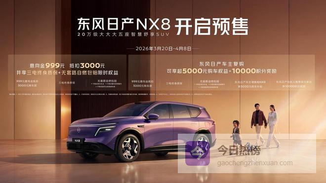 发布会上,东风日产宣布 NX8 即日起开启全国预售,并将于 4 月 8 日正式上市。为回馈首批预订用户,东风日产带来了五大预售专属权益: