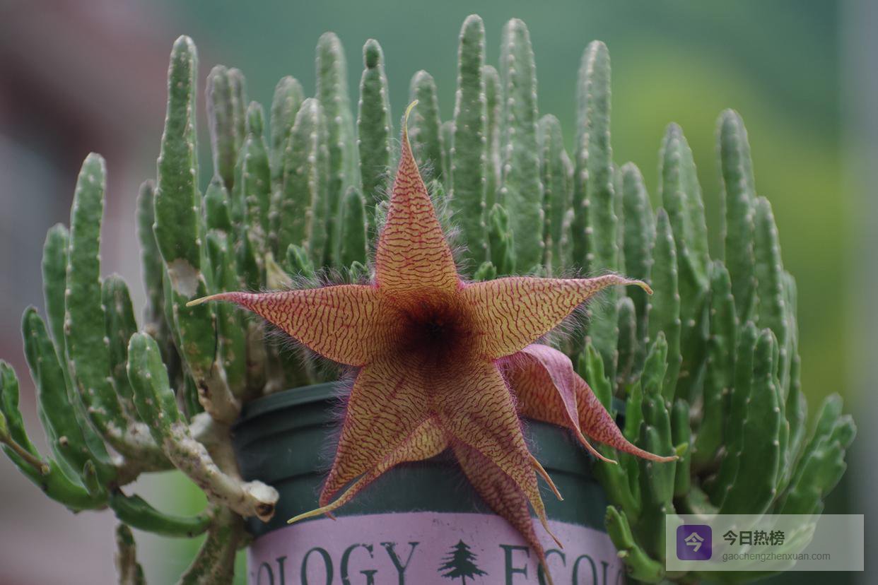 还有一回,我看见一户人家门口摆着一盆植物,茎干挺拔如仙人柱,挂着两个大花苞,眼看就要开了。我用手机识图软件辨认是“大花犀角”,花开像海星,布满条纹,散发臭味,所以也叫臭肉花、大豹皮花。