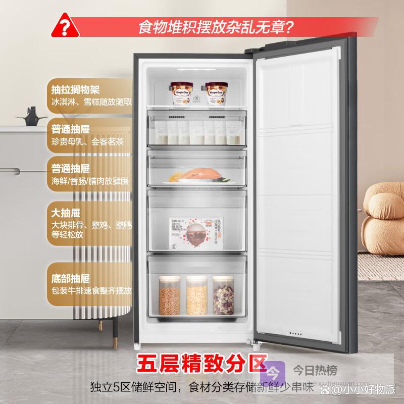 4️⃣抽屉式设计超方便:它采用抽屉式设计,155升的容量被合理划分成多个抽屉。找东西的时候,不用像传统冰柜那样翻来翻去,直接拉开对应的抽屉就能轻松拿到想要的食物,方便又快捷。而且抽屉式的设计还能避免食物之间相互串味,让每种食物都能保持自己独特的味道。
