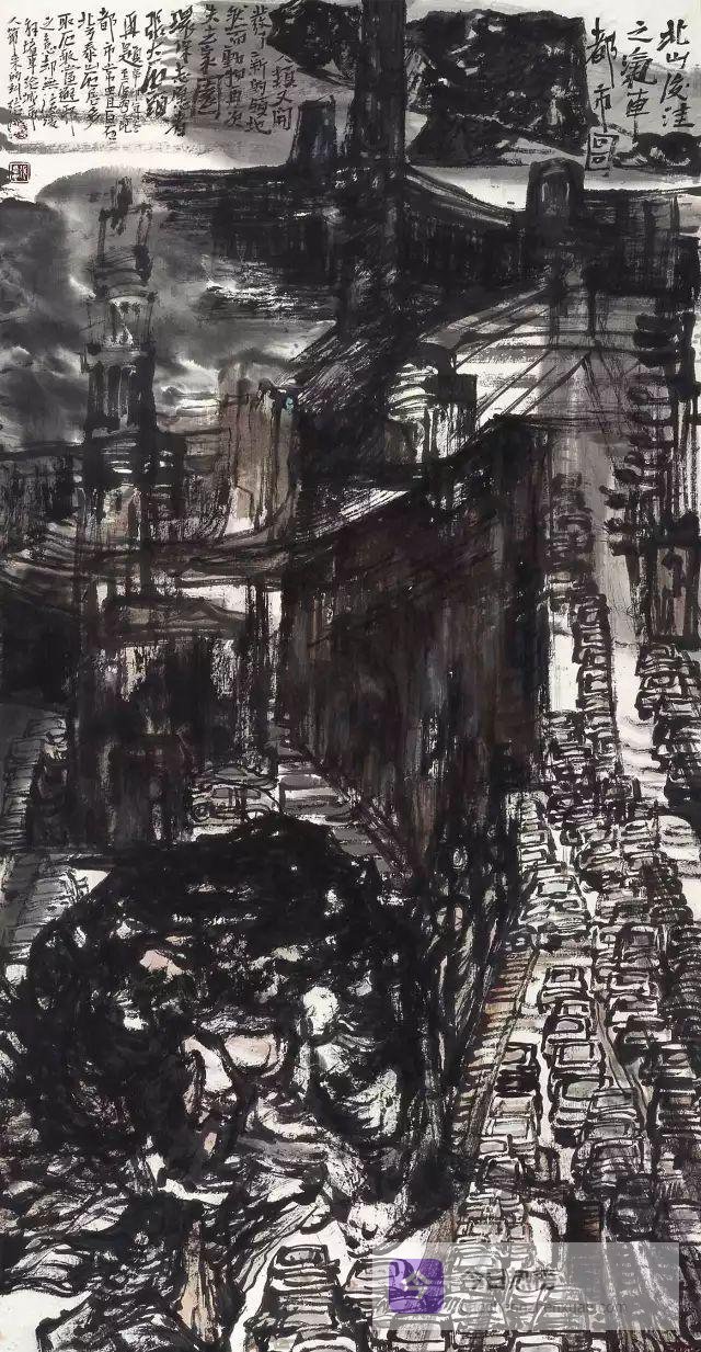 当都市钢铁森林拔地而起,张志民却选择用毛笔去“丈量”它们。《北山后洼之汽车都市》里,水泥丛林与云烟墨气交织, 干湿浓淡之间,传统笔墨竟与玻璃幕墙达成和解。他让水墨不只是“乡愁”的代用品,更是“时代现场”的速写本。