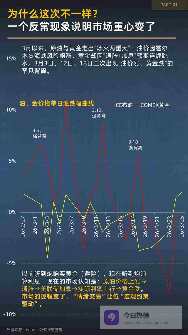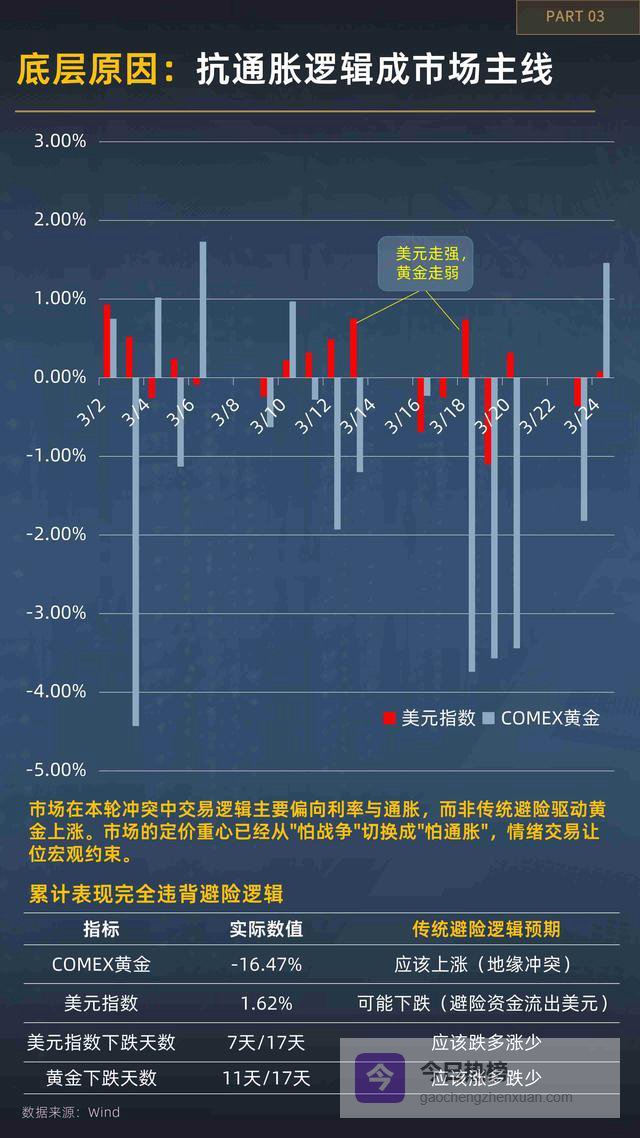 与此同时,资产价格的联动关系也出现结构性变化。3月以来,国际油价与黄金价格多次出现“背离走势”:油价因供给扰动上行,而黄金在利率预期抬升背景下走弱。数据还显示,在统计区间内,黄金累计表现明显偏弱,而美元指数则相对走强。