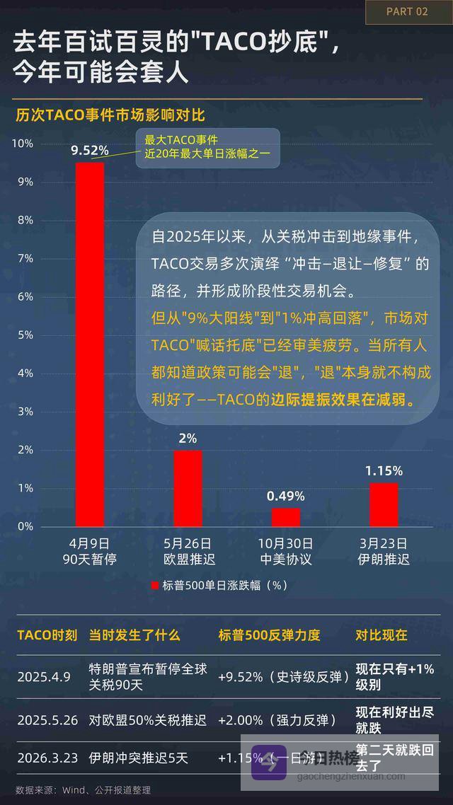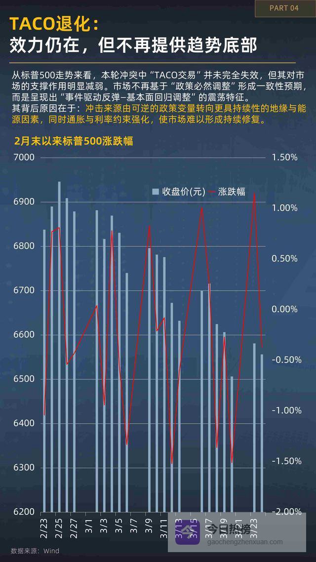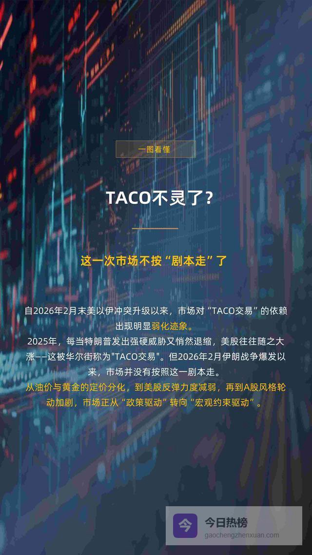 自2026年2月末相关冲突升级以来,曾在2025年屡次奏效的“TACO交易”出现明显弱化迹象,市场对政策“边际转向”的依赖正在下降。