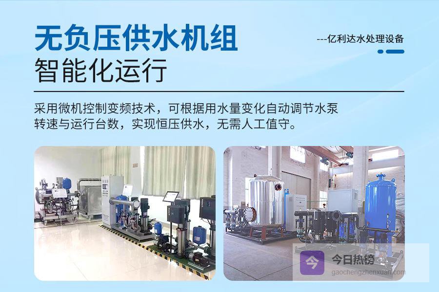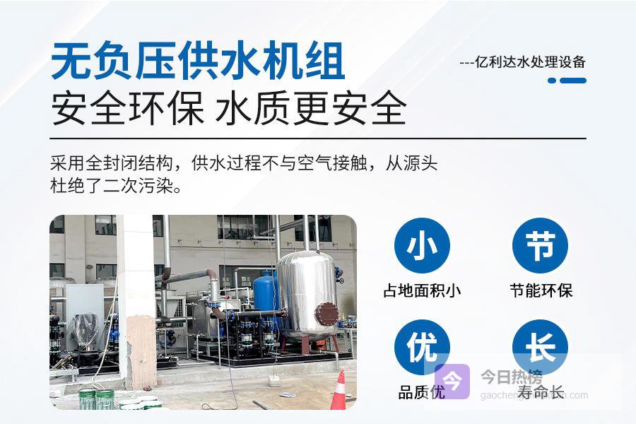 无负压供水设备是一种新型的供水设备。它能直接与自来水管网连接,充分利用管网原有的压力,避免了传统水箱供水方式中的水质污染问题。江苏亿利达的无负压供水设备采用先进技术,能够根据实际用水量自动调节水泵的运行,实现节能效果。