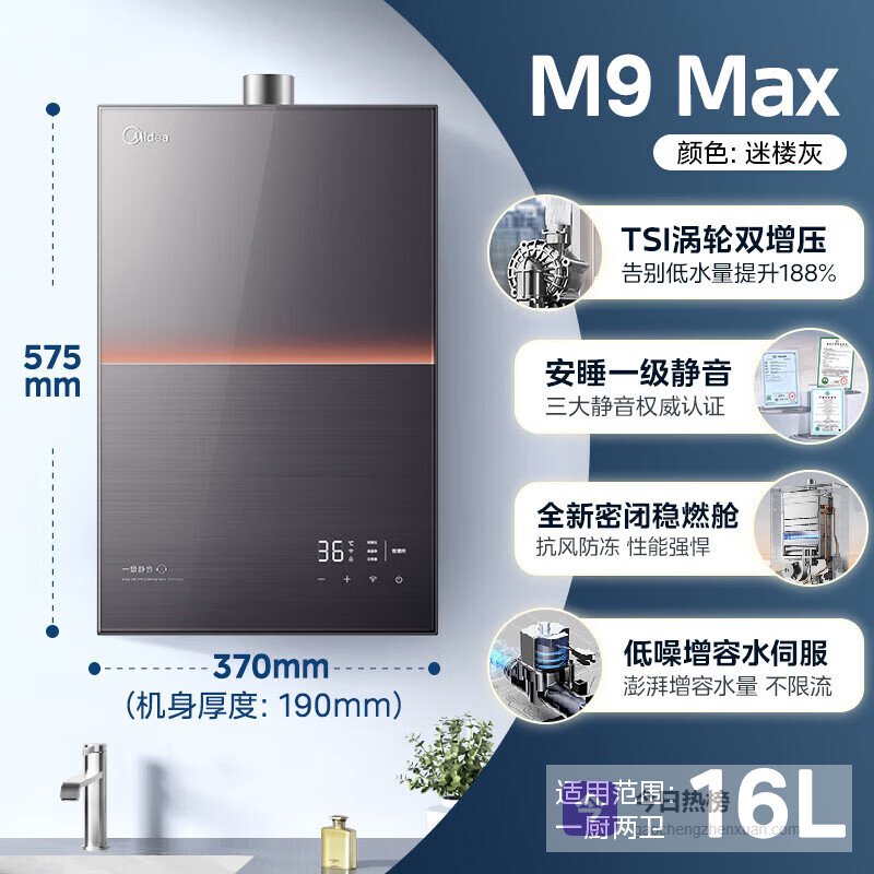 美的(Midea)安睡M9max燃气热水器家用瓦斯16升静音增压可选零冷水恒温 JSQ30-M9Max迷楼灰水量188% 瓦斯¥