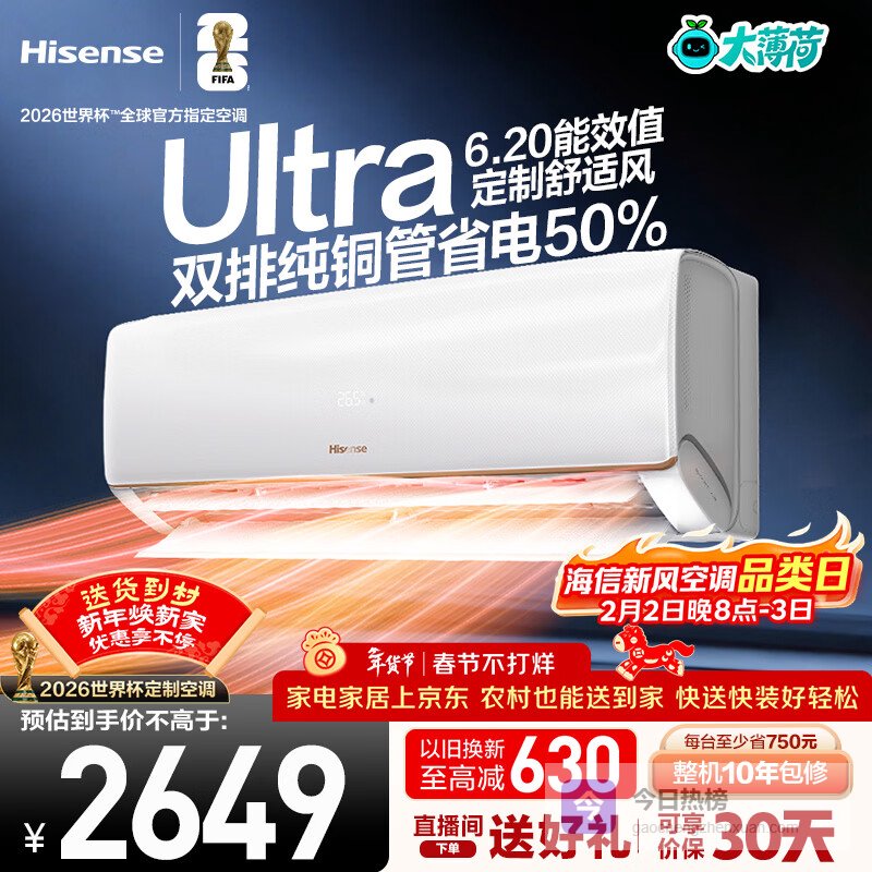 【京东自营】海信大薄荷智省电Ultra世界杯定制空调大1.5匹双排铜管AI省电50%双翼定制风KFR¥