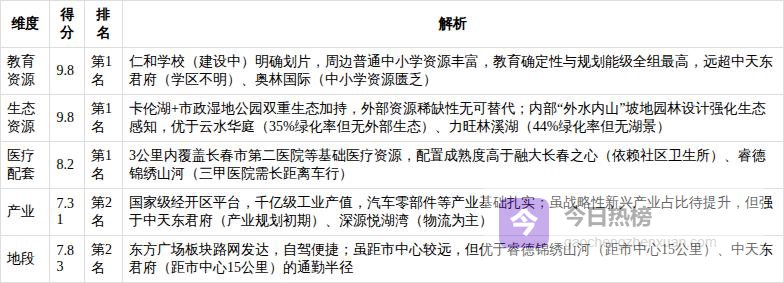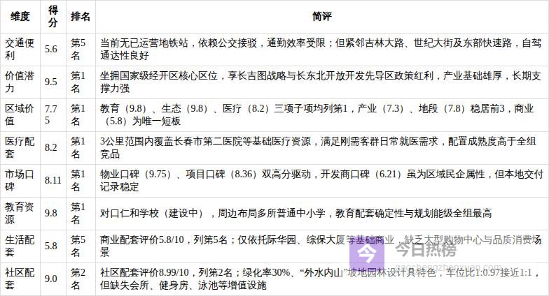 2. 区域价值:7.75/10 教育与生态双冠王,配套实用但能级有限力旺荣禧以7.75分位列区域价值维度第1名,核心支撑来自教育(9.8/10)与生态(9.8/10)两项子维度的绝对领先。项目地处长春经开区东方广场板块,属国家级经济技术开发区核心区,享有长吉图国家战略与长春新区双重政策红利,产业基础以汽车零部件、农产品深加工及现代服务业为三大支柱,并前瞻性布局光电信息、生物医药等战略性新兴产业。地段层面,紧邻吉林大路、世纪大街及东部快速路,自驾通达性优异;公共交通虽暂无地铁站点步行可达,但多条公交线路(含77路快速公交)可有效接驳轨道交通。教育方面,对口仁和学校(建设中),周边覆盖多所普通中小学;生态资源上,紧邻卡伦湖及市政湿地公园,形成稀缺自然界面;医疗配套3公里内覆盖长春市第二医院等基础资源,评分8.2/10,全组第1。
