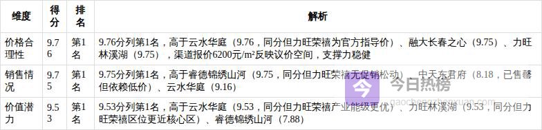 4. 市场表现:9.68/10 刚需性价比盘中的价格与销售双优典范力旺荣禧以9.68分位列市场表现维度第1名,是全组唯一突破9.6分的项目,展现出极强的刚需市场穿透力。其价格合理性(9.76/10)列第1名,成交均价6737元/m²,贴近区域公允价(7322元/m²),提供毛坯(约7300元/m²)与精装(约8500元/m²)双选项,分化定价策略给予刚需客群充分选择空间;销售情况(9.75/10)列第1名,虽近12个月销售额排名全市第151位,但2024年1月单月成交面积1.1万㎡位列当月全市第3,体现阶段性爆发力;价值潜力(9.53/10)列第1名,依托国家级经开区核心区位与长吉图战略红利,产业基础与政策支撑力全组最强。相较竞品,其表现全面优于深源悦湖湾(6.57)、日辉·会展新世界(6.43)、奥林国际(4.07)等尾部项目,亦稳胜力旺林溪湖(9.35)、云水华庭(9.16)等第二梯队。