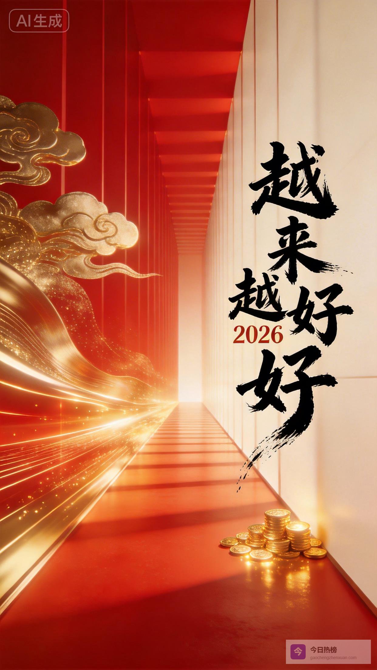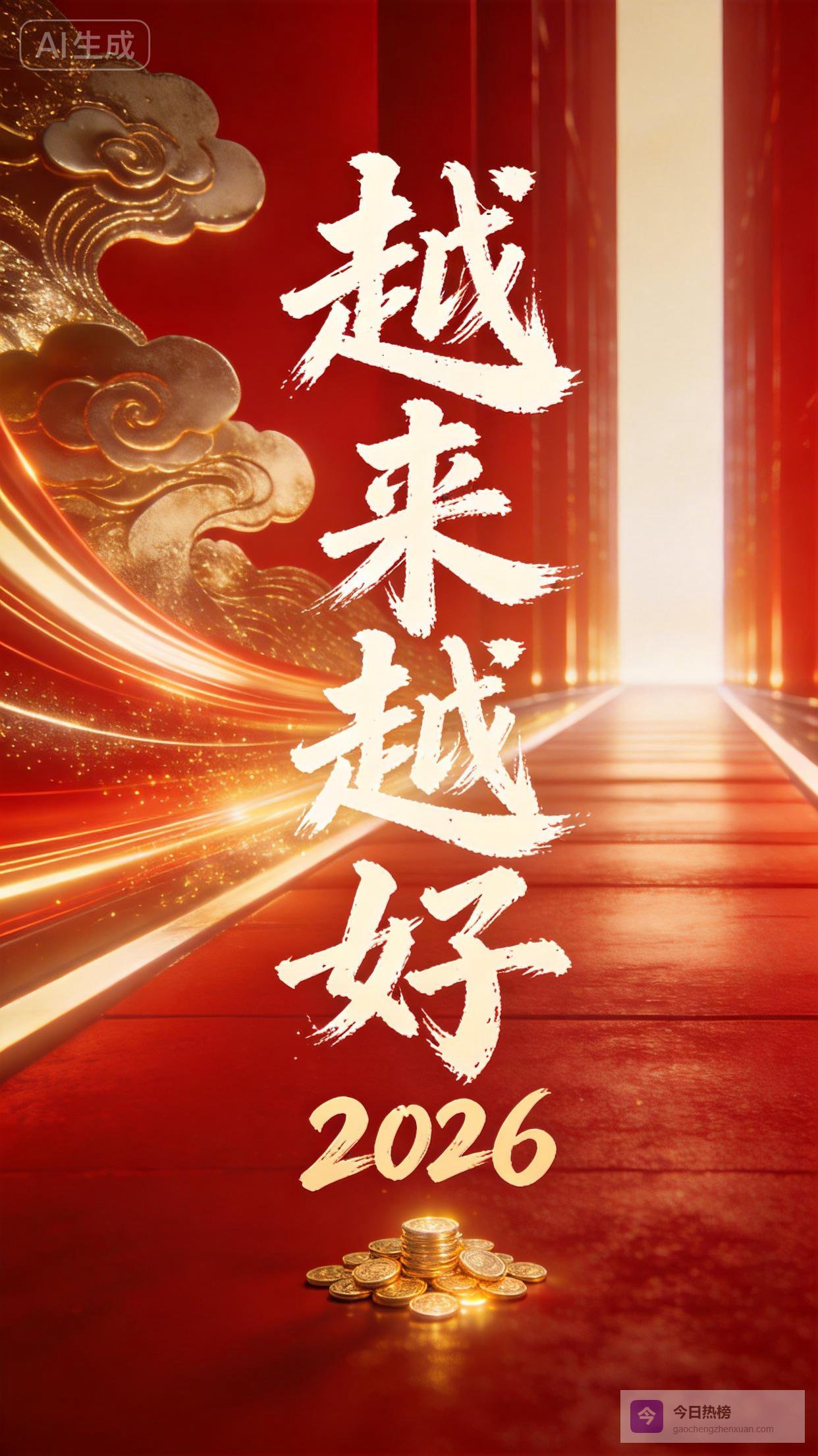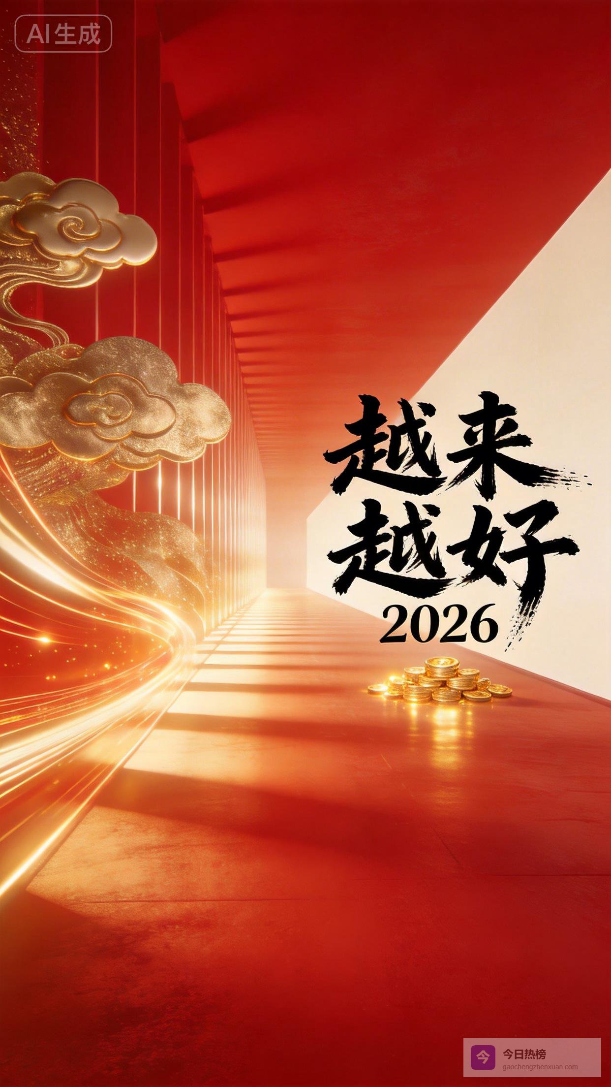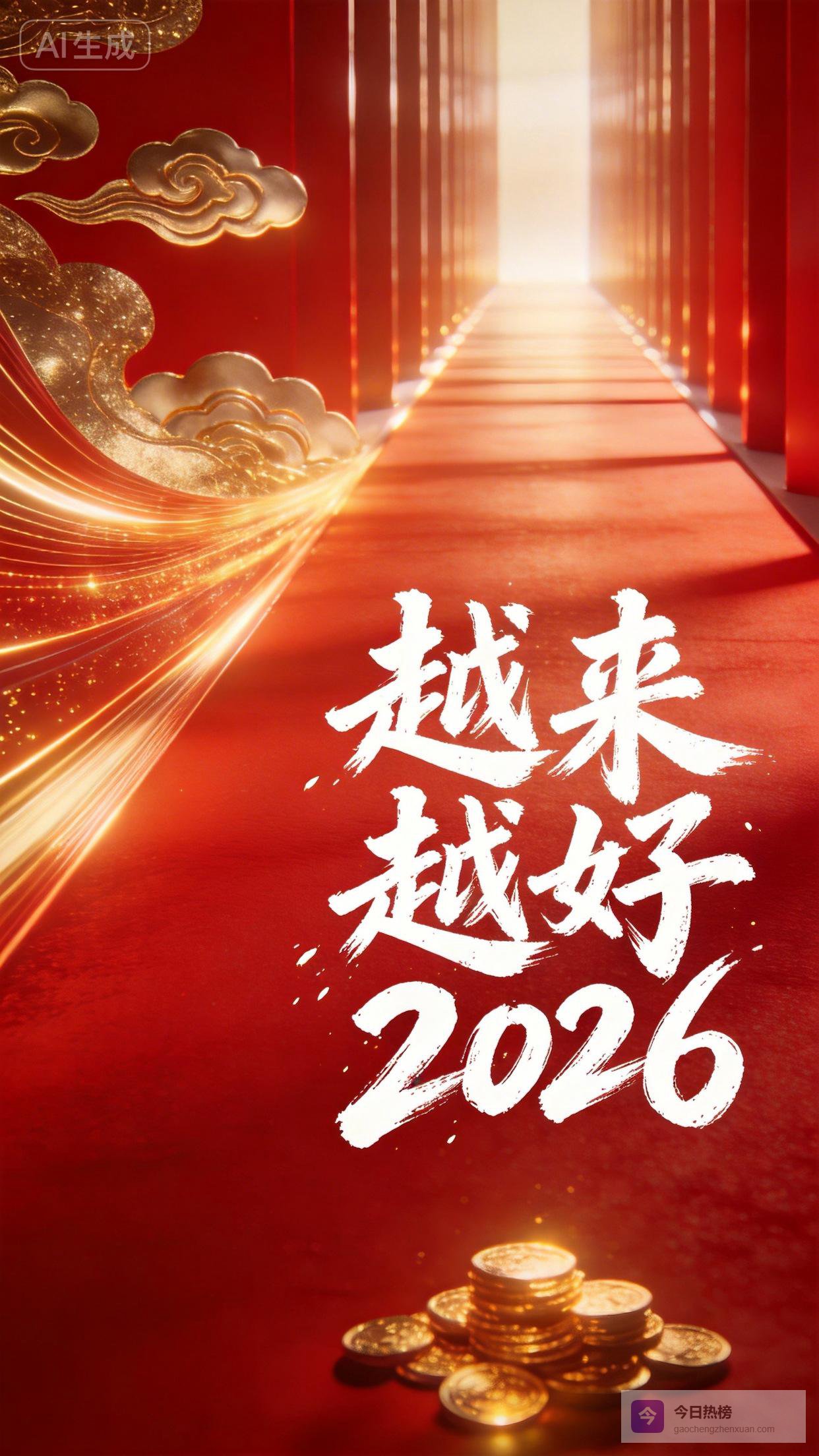 站在2025年的门槛上,我们凝望这幅画面,仿佛已经触摸到了2026年的脉搏。那红色是激情,那金色是梦想,那红毯是征程,那文字是信念,那金币是收获。2026年,注定是一个不平凡的一年,是一个充满希望与挑战的一年。让我们带着这幅画面的祝福,带着红金交织的力量,踏上那条通往辉煌的红毯,与光同行,与梦为伴,共同书写属于我们的2026奋进诗篇!