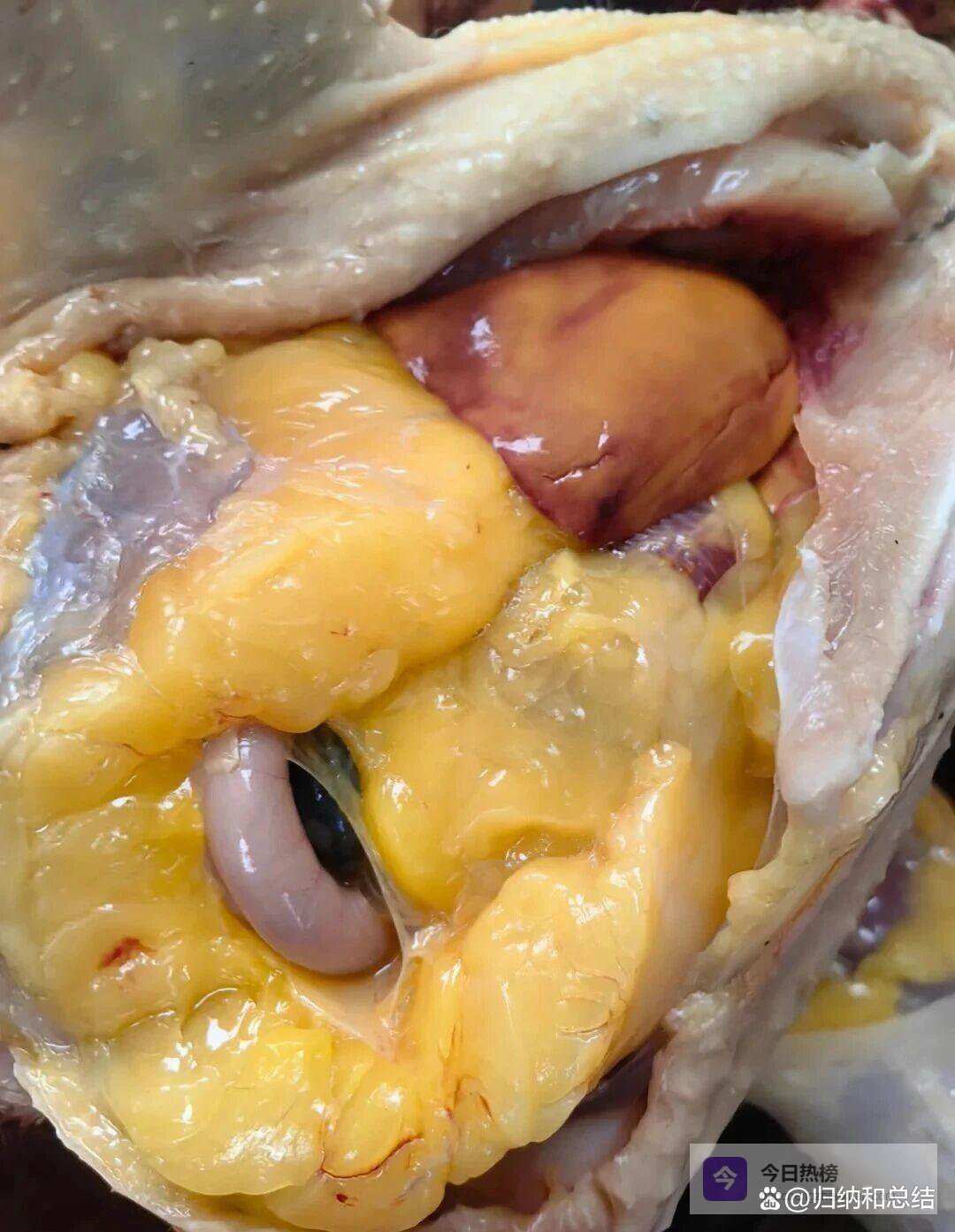 这块黄油,其实是鸡的“腹脂”,也就是腹腔内储存的脂肪组织,主要分布在鸡的腹部、肠道周围和屁股附近。它不是病变组织,也不是什么特殊器官,就是正常的脂肪。