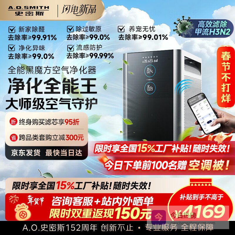 【京东自营】史密斯全能黑魔方空气净化器AirUltra母婴医护级除甲醛家用家电除异味过敏原细菌流感病¥