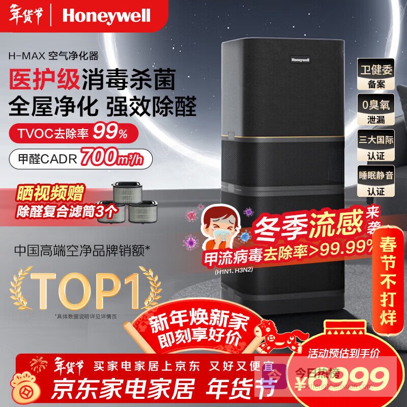 【京东自营】霍尼韦尔空气净化器除花粉甲醛细菌流感病毒卫健委备案消毒机hmax空间舱全屋速净家电KJ1¥