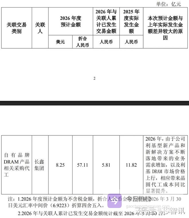 另一份《关于 2026 年度日常关联交易预计额度的公告》显示,兆易创新预计2026年全年将与长鑫科技集团及其主要业务子公司采购代工生产的DRAM相关产品的交易额度为8.25亿美元,折合人民币约57.11亿元。其中,已经发生的金额达5.81亿元。