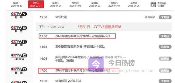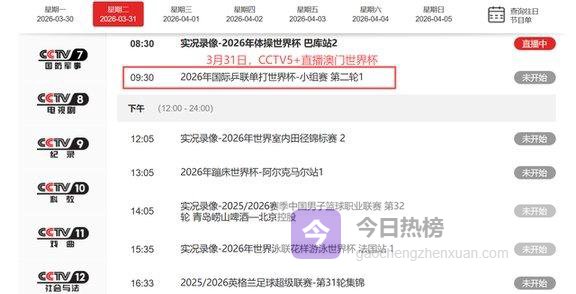 上午9点30分,CCTV5+直播澳门世界杯;中午12点30分和下午17点00分。则由CCTV5进行转播。比赛一场接一场地打,球迷要是想跟着看国乒这条线往下走。
