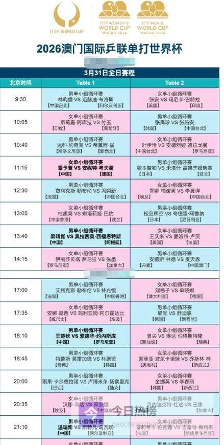 北京时间3月31日,澳门世界杯进入第二个比赛日。气氛一下子就又紧了起来。昨天国乒的开局还算漂亮,7战全胜,没有输球,主力打得干脆。替补也没掉链子。