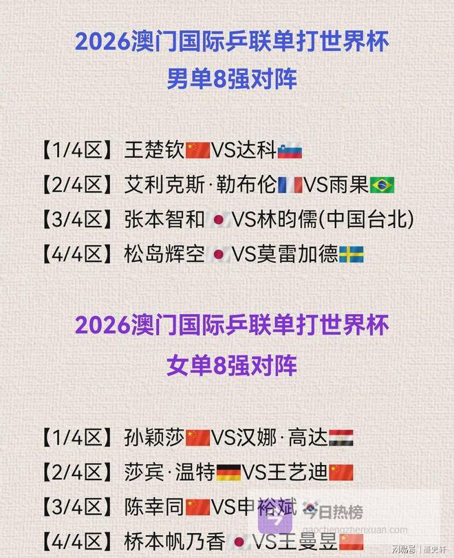 北京时间4月3日晚,2026国际乒联澳门单打世界杯1/8决赛全部结束,男女单打8强完整出炉!