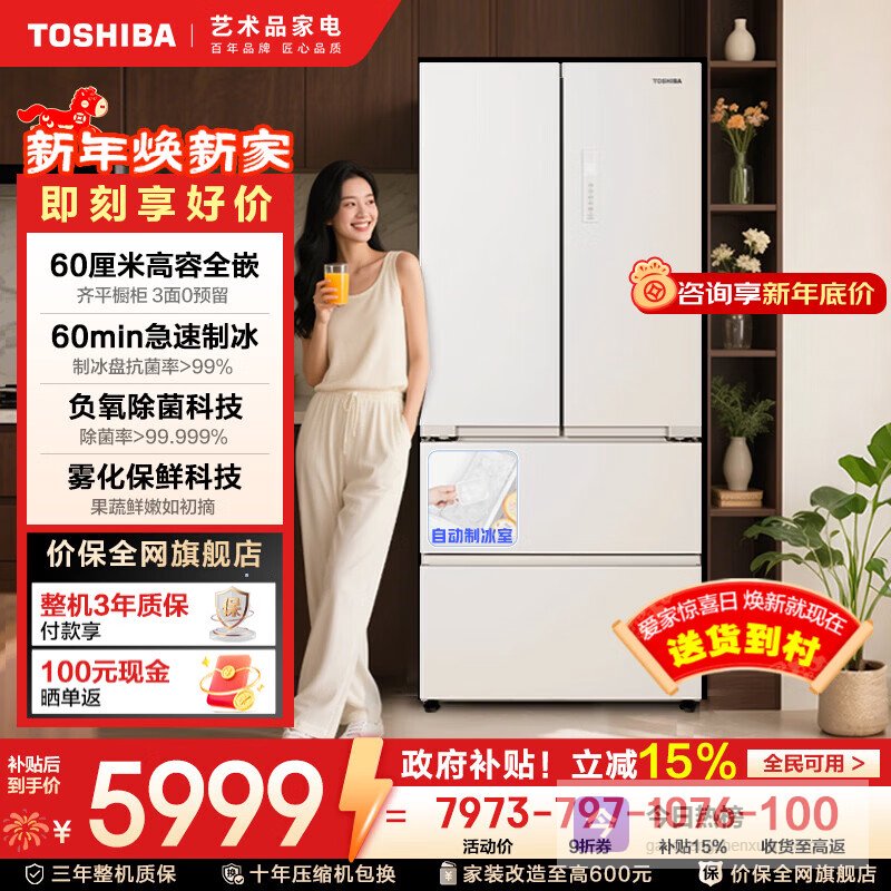 东芝(TOSHIBA)白珍珠548高容全嵌60cm超薄嵌入式大容量双系统风冷无霜全自动制冰法式多门国家补贴家用电冰箱 GR-RF548WI-PM165 云脂白¥