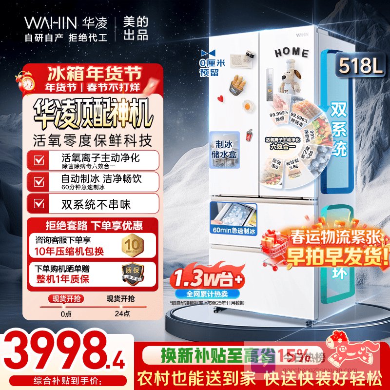 华凌冰箱美的出品神机机皇518自动制冰双系统60cm超薄零嵌法式家用电冰箱HR-518WUFIPZ家电国家补贴¥