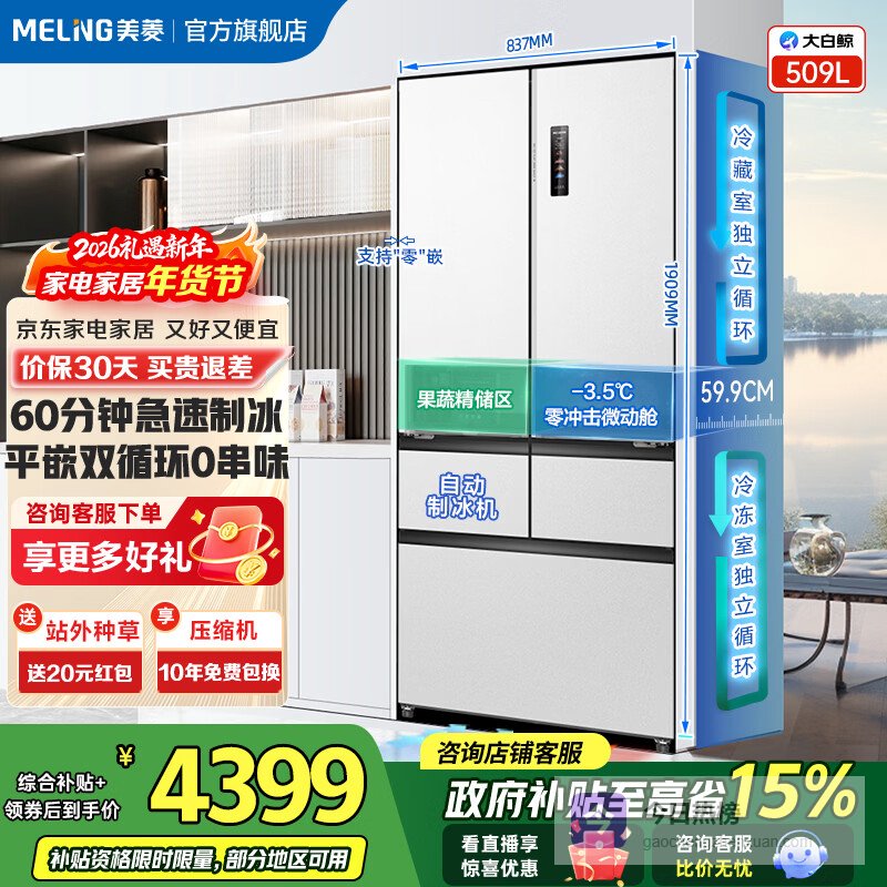 九、美菱1️⃣ 大容量储存:这台冰箱有509升的超大空间,可以放很多菜、肉、奶制品什么的,基本一家人的食材都能安排得妥妥的。法式五门设计让你每类食物都能分类存放,找东西特别方便,不用担心乱糟糟。
