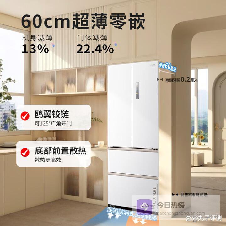 2️⃣ 超薄嵌入设计:冰箱厚度只有59.9cm,可以和厨房橱柜完美嵌合,空间利用率高,还能让厨房看起来更整洁漂亮。倒是不用费心找位置,嵌入式设计还挺节省空间的,整体感觉也更美观。
