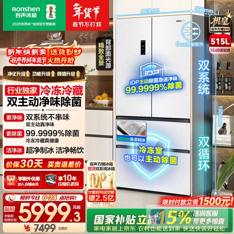 容声方糖515机皇双系统法式多门四开门超薄零嵌入式电冰箱家用自动制冰一级能效国家补贴世界杯 BCD-515P60FZNAD 织影白¥