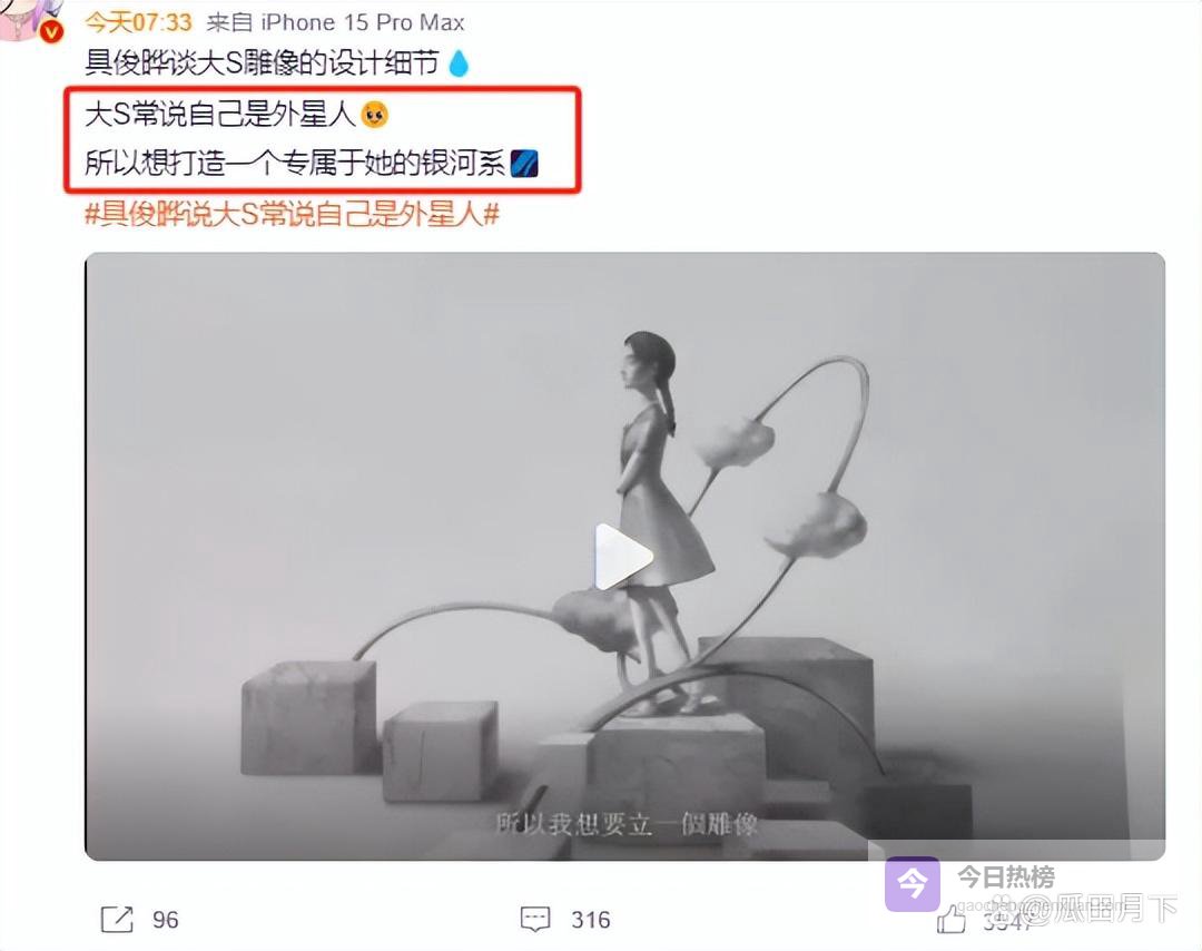 在众人的质疑声中,欧巴的设计团队发声解释了,原来这雕像设计不为还原大S的样貌,只为宣扬她的精神,