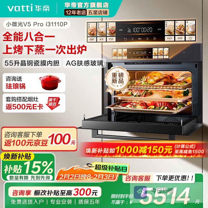 【品牌直营】华帝微蒸烤一体机【小微光V5Pro】55L嵌入式微波炉多功能烤焗炖炸煎炒8合1晶钢瓷膜国¥