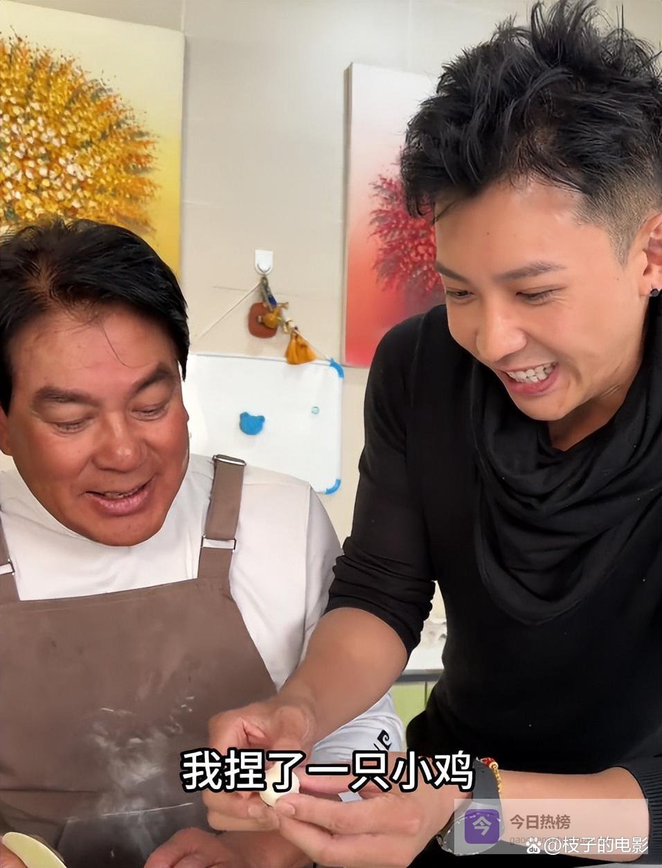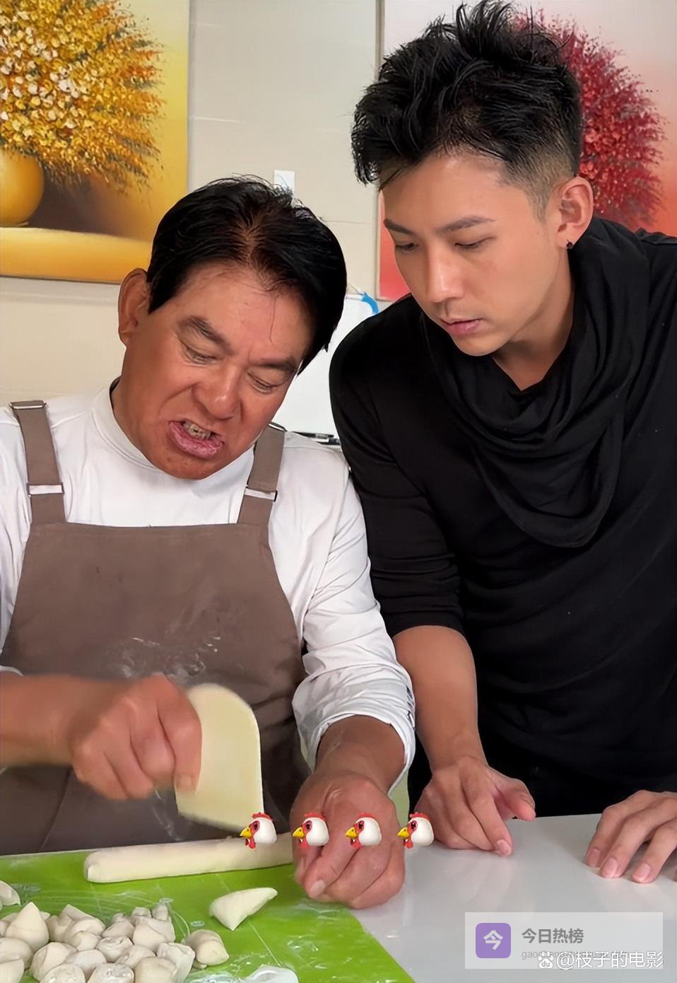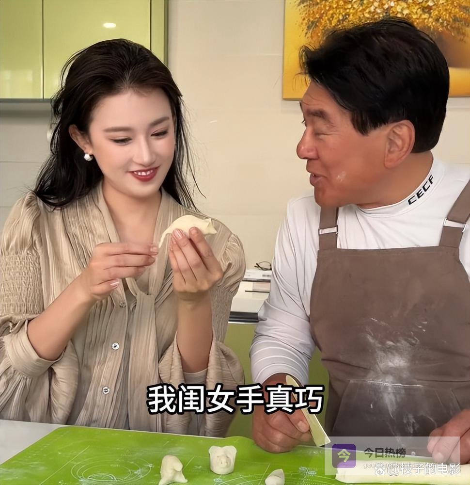 视频中朱先生带着围裙正切着包饺子的面团,旁边的女儿搞怪的捏了不同形状的面团给他看。