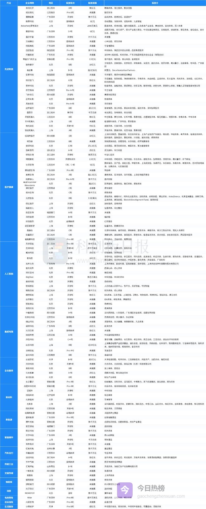从投资事件数量来看,先进制造、医疗健康、人工智能、集成电路、新材料、企业服务等领域较活跃;从融资总额来看,先进制造披露的融资总额最多,约34.18亿元。星海图完成由华登科技、蓝思科技、矽芯投资、时代伯乐、航发基金、修远资本、弘章资本、御海资本、金融街资本、金浦投资、国元股权、北京科创基金、中金资本、普华资本、洪泰基金、广发乾和等共同参与的20亿元B 轮融资,为本周披露金额最高的投资事件。