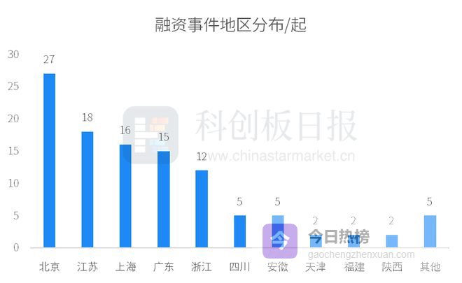 从地区来看,本周北京、江苏、上海、广东、浙江等地公司较受青睐,融资事件数均在10起以上;北京以27起融资活跃度保持首位。从单个城市看,北京有27家公司获投,位列第一;上海紧随其后,有16家公司获投。