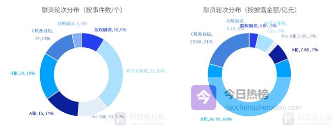 从投资轮次来看,除股权融资外,本周种子天使轮融资事件数最多,发生33起,占比约30%;其次是B轮,发生20起,占比约18%。从各轮次获投金额来看,B轮披露的融资总额最高,约68.85亿元;其次是C轮及以后,约23.60亿元。