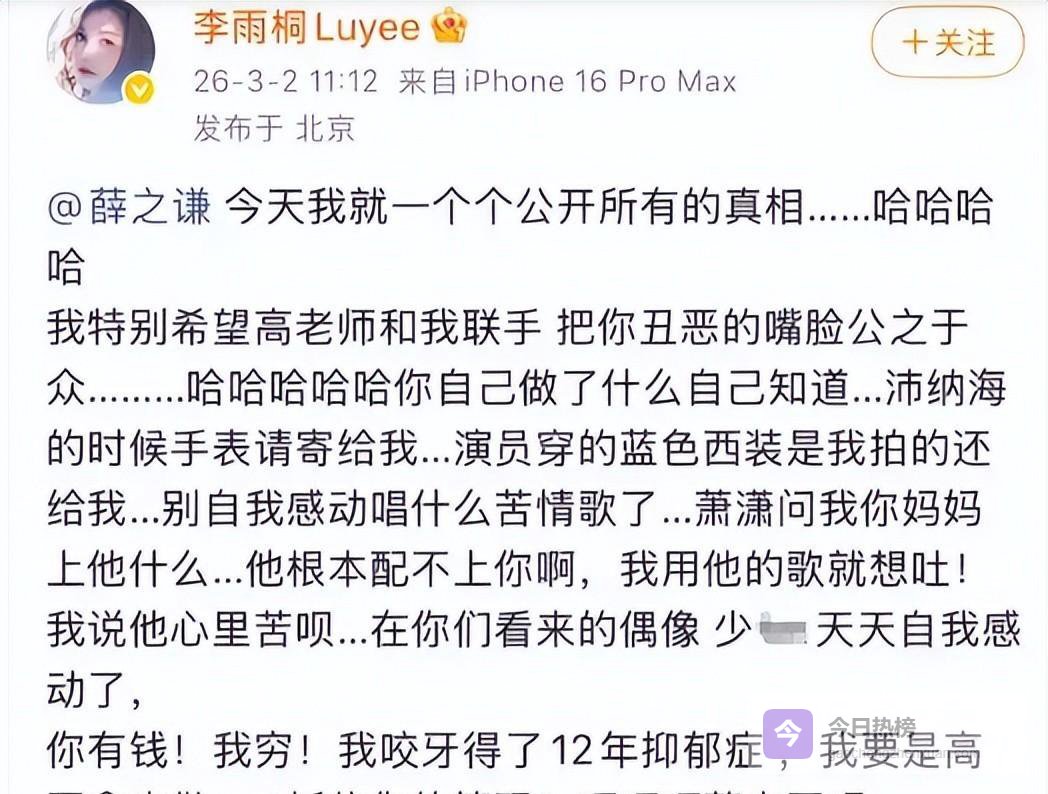 事情的起因,是在3月2日,薛之谦的前女友李雨桐接连不断地爆出了一系列炸裂的料。