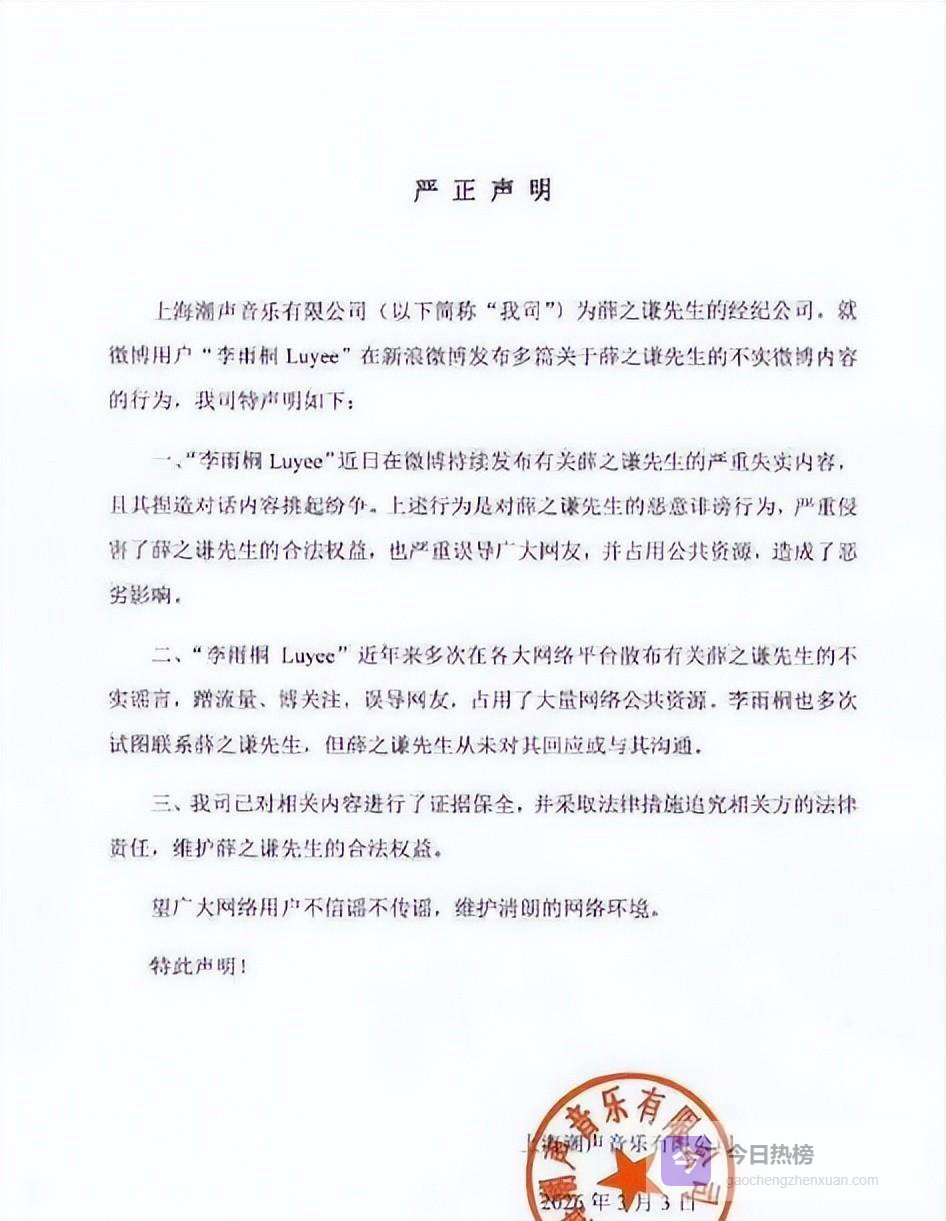 到目前为止,薛之谦本人还没有对谢娜的呼喊做出任何正面回应,他的经纪公司只是就李雨桐的爆料发了一份澄清声明,表示会追究法律责任。