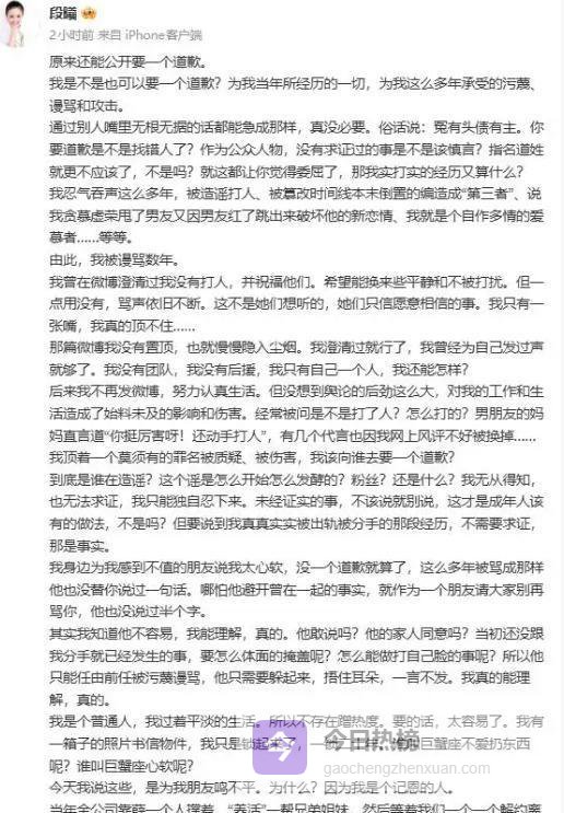 可能是谢娜那句“道歉”戳中了某些深埋心底的记忆,段曦发了一篇字字泣血的长文,一开头就直指谢娜:“原来还能公开要求一个道歉。我是不是也可以要一个道歉?为我当年所经历的一切,为我这多年来承受的污蔑、谩骂和攻击。”