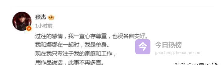他的话挺简练的,但每个字都挺有分量:“以前的感情,我一直保持尊重,也祝大家都好。我和娜娜在一起时,我是单身。现在我只专注于家庭和工作,用作品表达自己,这事就不多说了。”