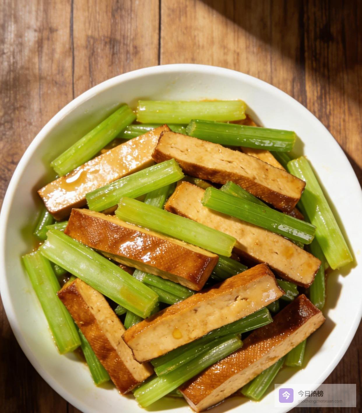 芹菜在中医看来,味辛、甘,性凉,是清热平肝、降压安神的“明星蔬菜”。它里面含有的芹菜素,被称为“天然降压药”,能帮助舒缓紧张的神经,平稳情绪。香干是大豆制品,富含优质植物蛋白,和芹菜搭配,营养上能互相补充。