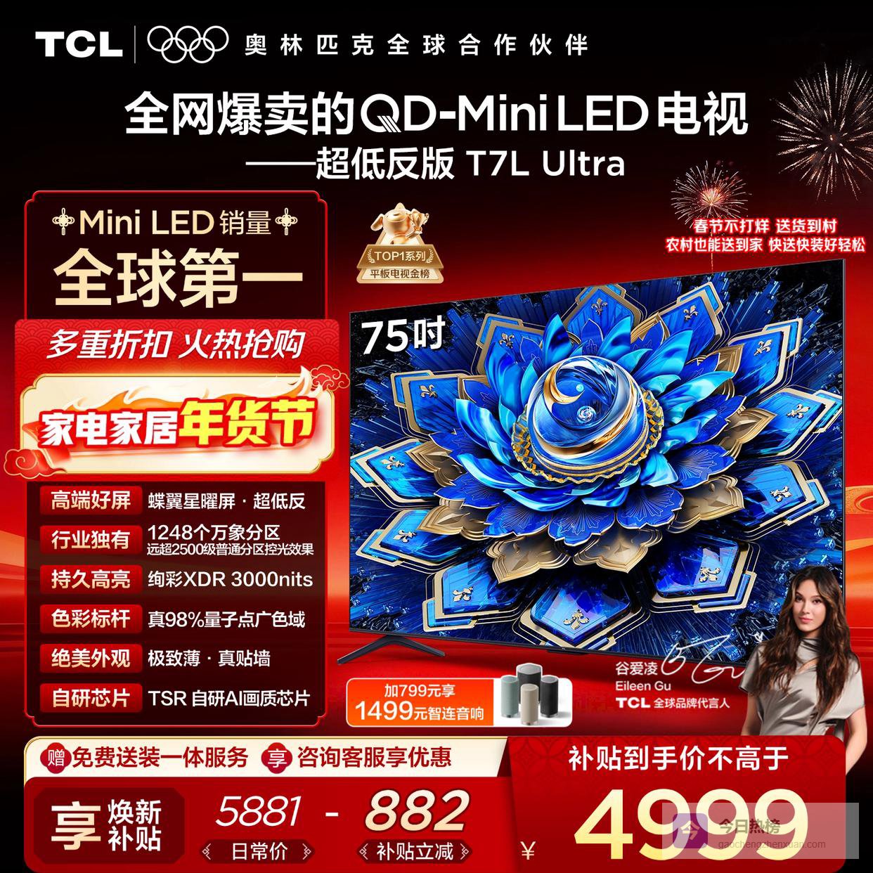 TCL电视 75T7L Ultra 75英寸 QD-Mini LED 蝶翼星曜屏 万象分区 绚彩XDR 3000nits 超薄 国家补贴 T7L¥