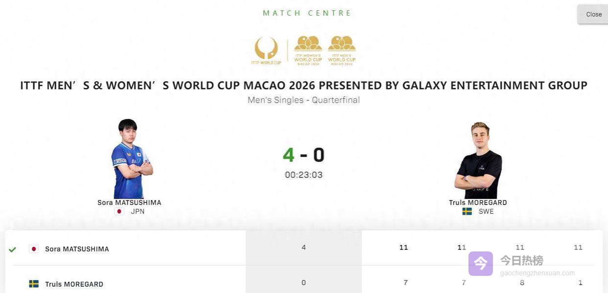 这场比赛,松岛辉空以4-0的总比分横扫莫雷加德,四局比分是11-7,11-7,11-8,11-1。要知道,在此前两人的六次交手中,莫雷加德赢了五次。这一次,局面被彻底颠覆。