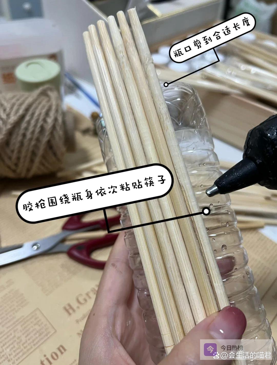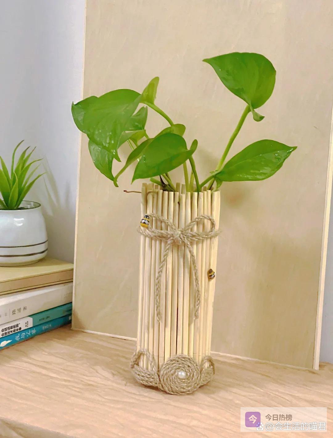 然后将一次性的筷子用热熔胶固定在饮料瓶外边,做好了之后可以使用麻绳简单装饰一下,好的花瓶可以水培植物,也可以用来盆栽立马颜值就高了很多。
