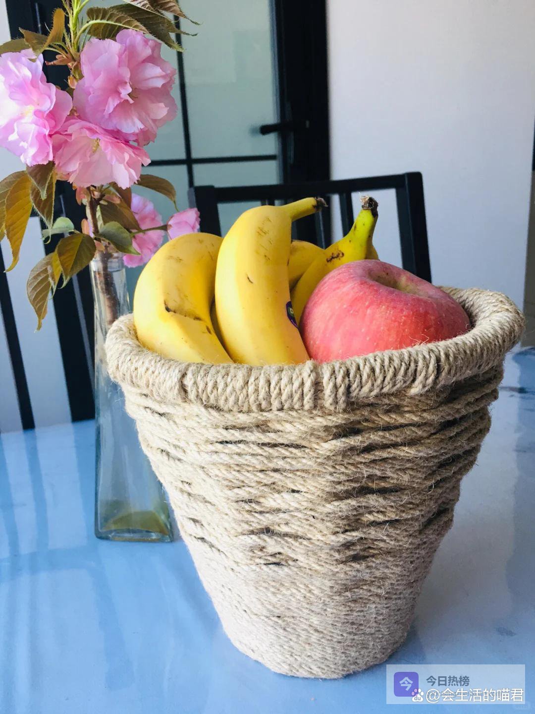 缠绕好了之后,在最边缘的位置简单处理一下,如果不稳固的话,使用热熔胶将它们固定住,做好了就变成了一个很好看又实用的水果篮。