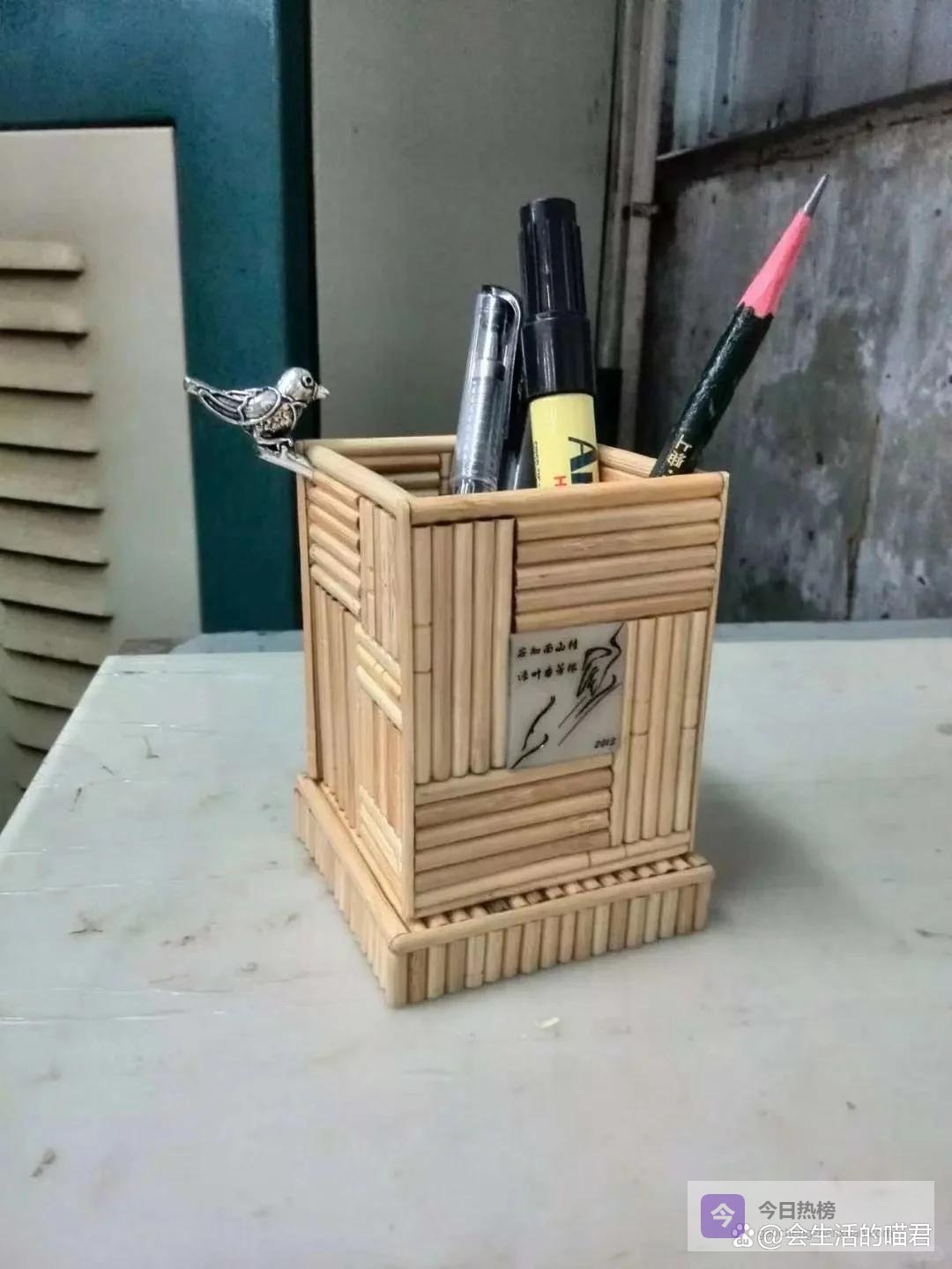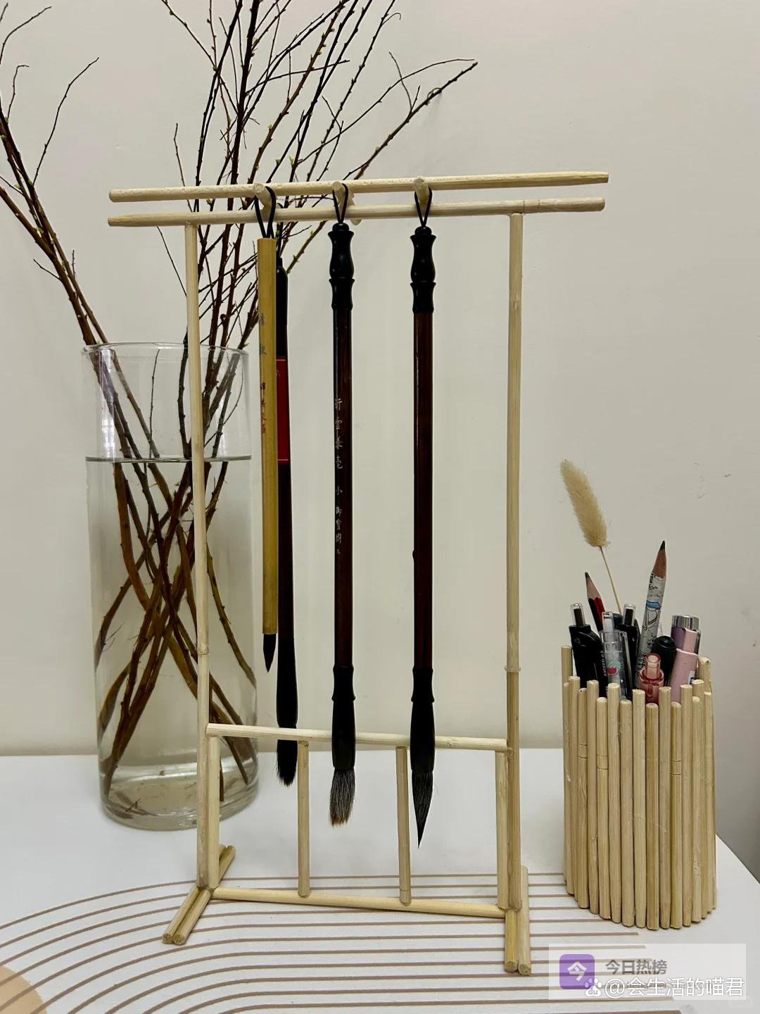 除了制作毛笔架以外,还可以使用一次性筷子改造笔筒,可以发挥想象,利用一次性筷子和热熔胶,做好的笔筒不比买的差,放在桌面上又好看又实用。