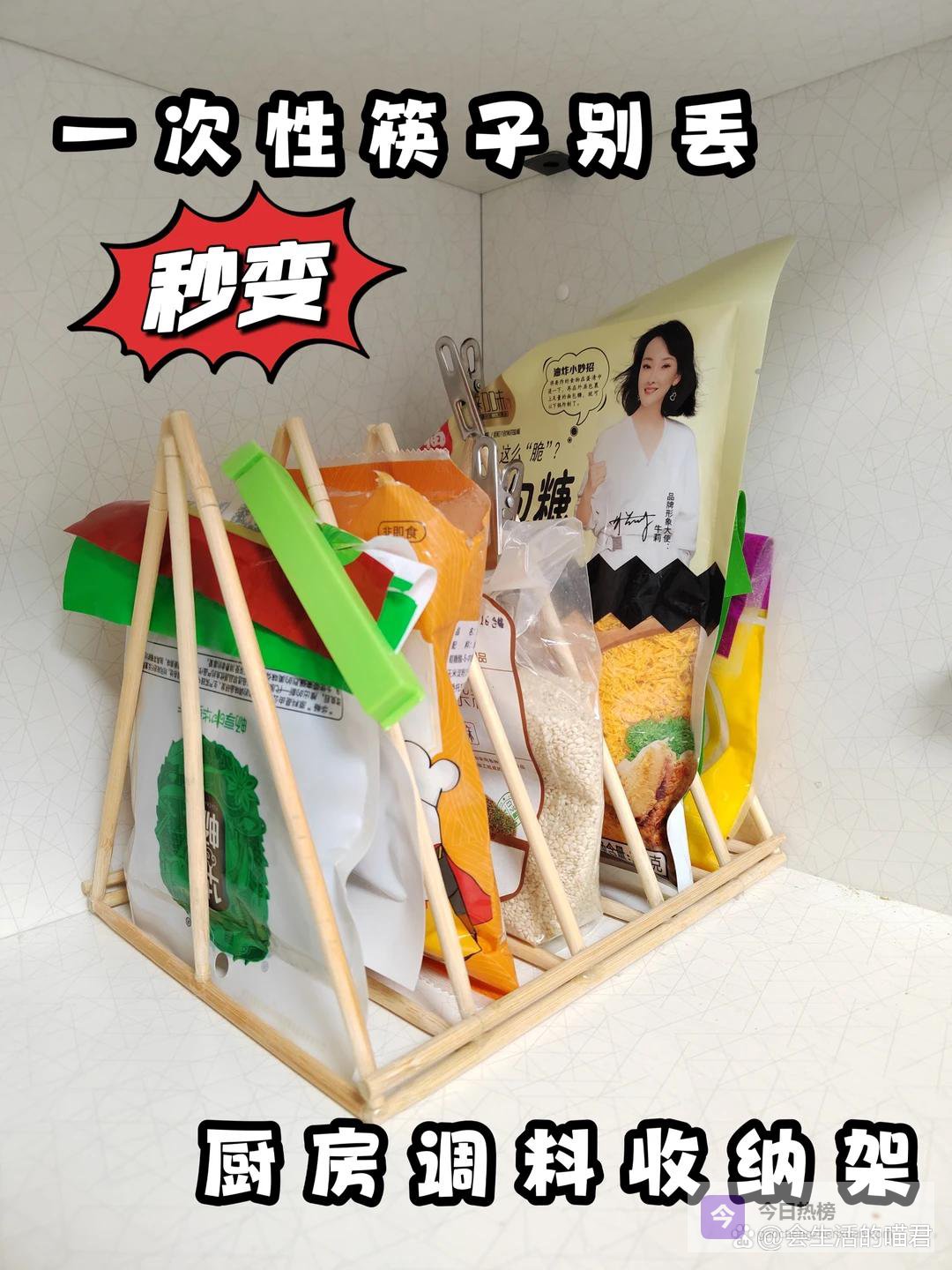 厨房的调味料开封之后很容易弄散,要将它们竖起来放在收纳架当中,方便使用,才不会弄散,不用花钱去买收纳架,如果你家里有很多一次性筷子,
