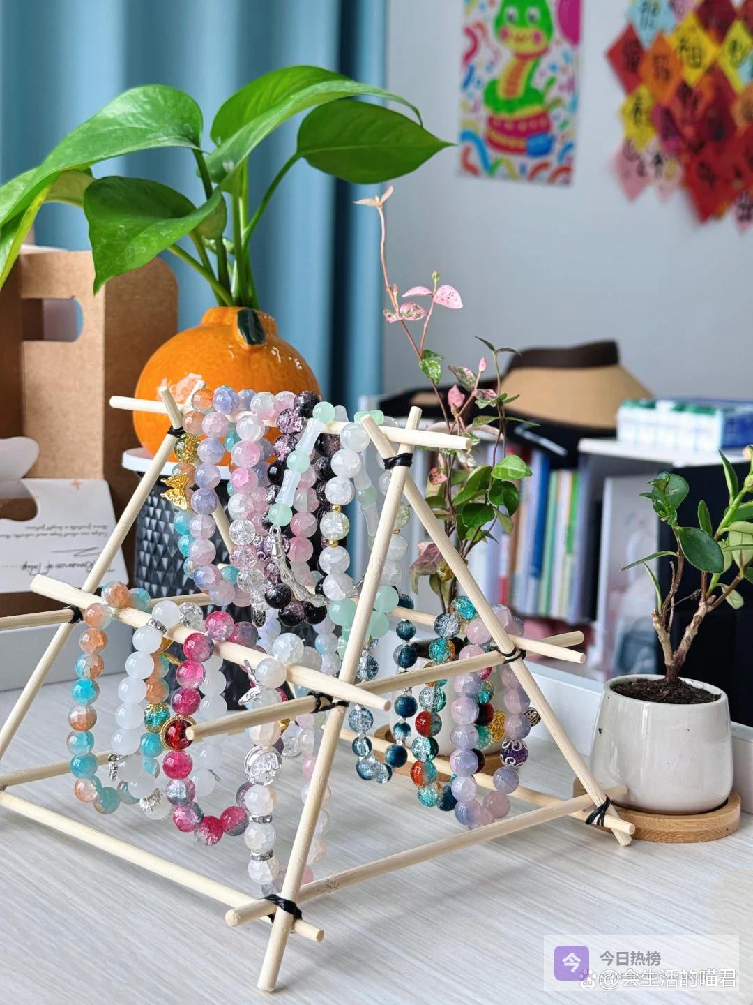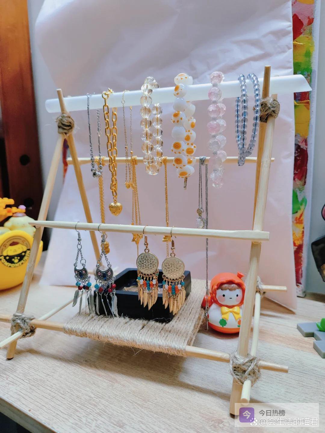 如果没有热熔胶,也可以使用扎头发的小皮筋,固定好了之后放在桌面上,手环,手链,项链,耳环都可以挂在上面,简单又方便。
