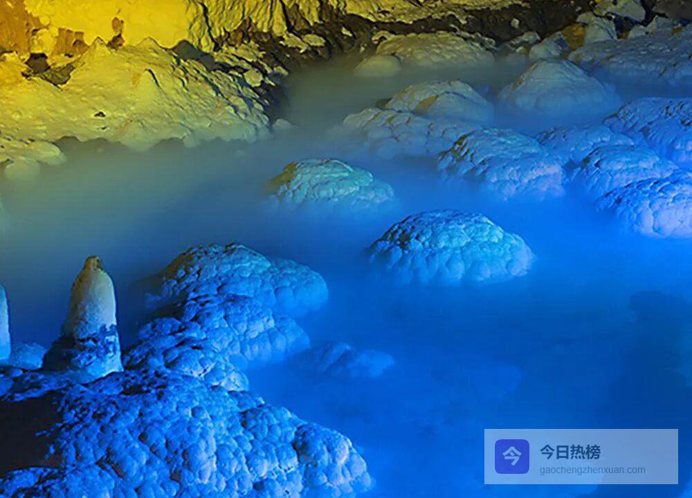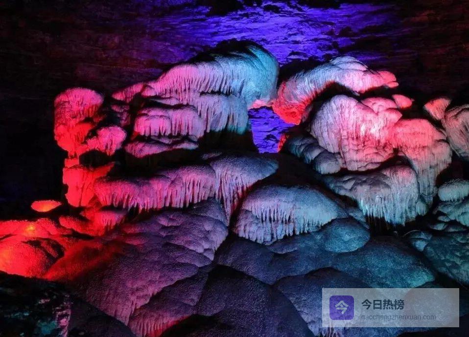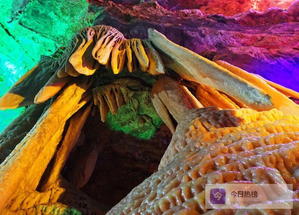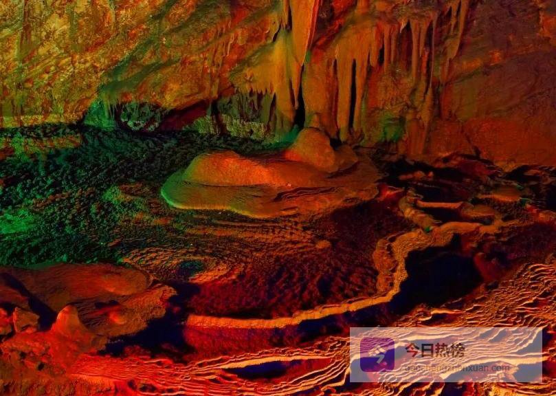 抬头还能看见“海龟护宝”“三灯石笋”等造型,晶莹的“鹅管”“珍珠宝塔”“采光壁”五彩石旗、石盾比比皆是,月奶石莲花更是首次在中国洞穴被发现。